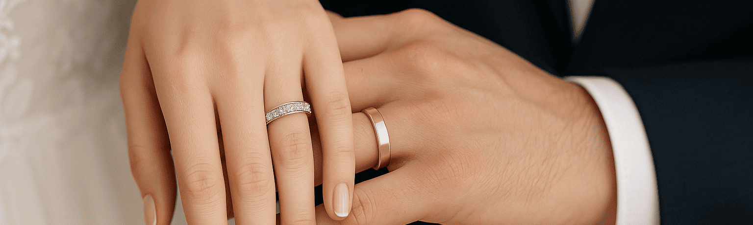 Nem kell egyforma gyűrűt választani ahhoz, hogy szép párost alkossatok. Lehet rozé–fehér kombináció, különböző szélesség, más felület —-sokszor épp ez teszi széppé a gyűrűpárt.