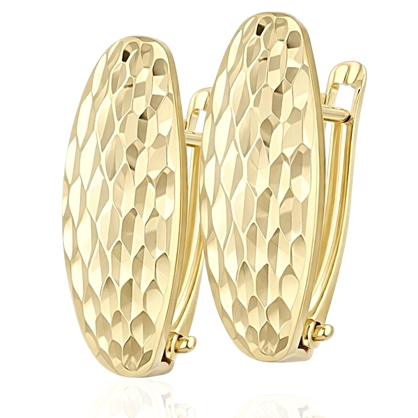 Ez a francia kapcsos arany fülbevaló sűrűn tagolt, gyémántvésett felületével élénk fényjátékot ad. Az enyhén ívelt forma szépen érvényesül viselés közben, a francia kapcsos zár pedig kényelmes és biztonságos rögzítést biztosít.