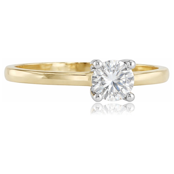 Ez a sárga arany szoliter eljegyzési gyűrű kerek csiszolású központi kővel készült, amelyet fehér arany foglalat emel ki. A kétszínű kialakítás finoman hangsúlyozza a kő ragyogását, miközben megőrzi a szoliter gyűrűk letisztult eleganciáját. Karcsú sínje kényelmes viseletet és időtálló megjelenést biztosít. Ideális választás a klasszikus eljegyzési stílus kedvelőinek.