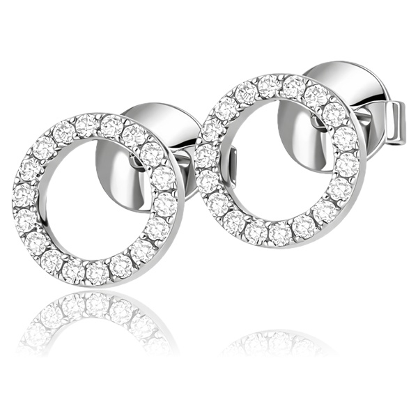 Ez a fehér arany fülbevaló letisztult, kör alakú formával és teljes felületén finoman foglalt gyémántokkal készült. A nyitott középrész és a körívet követő kövezés modern, mégis időtálló megjelenést ad az ékszernek. Elegáns, kényelmes viselet, amely tökéletes választás mindennapokra és alkalmi megjelenéshez is.