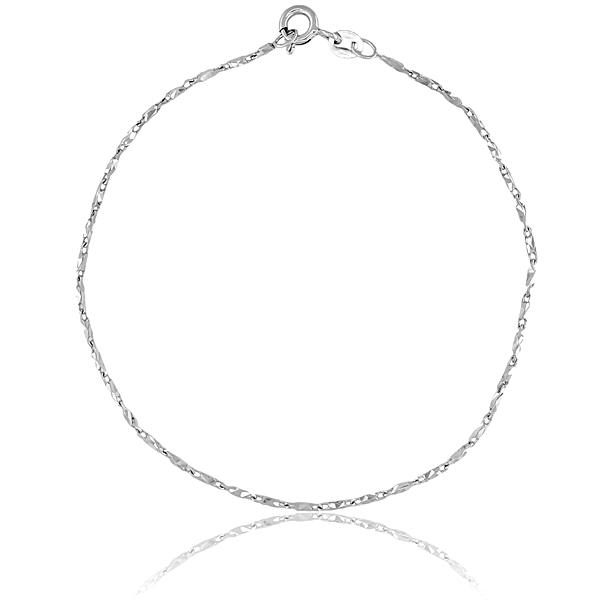 Finom fehér arany karkötő különleges, gyémántvésett felületű fantázia láncszemekkel. A vésett részletek apró fénytörései elegáns, visszafogott csillogást adnak, miközben a vékony kialakítás letisztult összhatást teremt. Diszkrét, időtálló darab, amely jól illeszkedik a mindennapi viselethez.