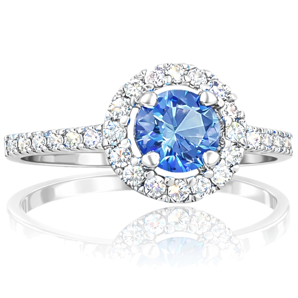 Fehér arany eljegyzési gyűrű brill csiszolású kék cirkónia központi kővel, halo foglalatban. A központi követ körülölelő apró kövek tovább erősítik a fényt, az oldalsó köves sín pedig szépen keretezi az összképet. Az összhatás látványos, elegáns és harmonikus.