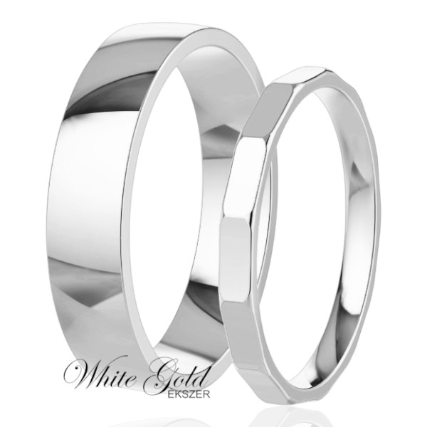 Egyedi megjelenésű fehér arany karikagyűrű pár, ahol a férfi gyűrű klasszikus, sima felületű, míg a női gyűrű lapidált, azaz finoman csiszolt, sokszögű formája modern, mégis elegáns hatást kelt. Tökéletes választás azoknak, akik a letisztult, de karakteres stílust kedvelik.