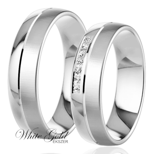 Klasszikus stílusú fehér arany karikagyűrű pár, ahol a matt és fényes felületek elegáns kontrasztot alkotnak. A női gyűrűt finom kősor díszíti, mely csillogásával még különlegesebbé teszi. Időtálló választás, amely egyszerre modern és letisztult.