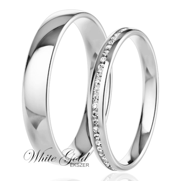 A klasszikus és modern elegancia tökéletes harmóniáját testesíti meg ez a fehér arany karikagyűrű pár. A női gyűrűt finom, körbefutó kősor díszíti, amely ragyogó fényt kölcsönöz, míg a férfi gyűrű letisztult, fényes felületű. Időtlen szépség minden részletében.