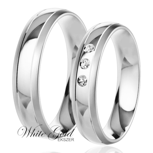 Ez a fehér arany karikagyűrű pár a klasszikus formát modern eleganciával ötvözi. A női gyűrűt hármas kősor díszíti, amely visszafogott, mégis látványos csillogást ad. A férfi gyűrű letisztult, fényes felületével tökéletesen harmonizál a női darabbal.