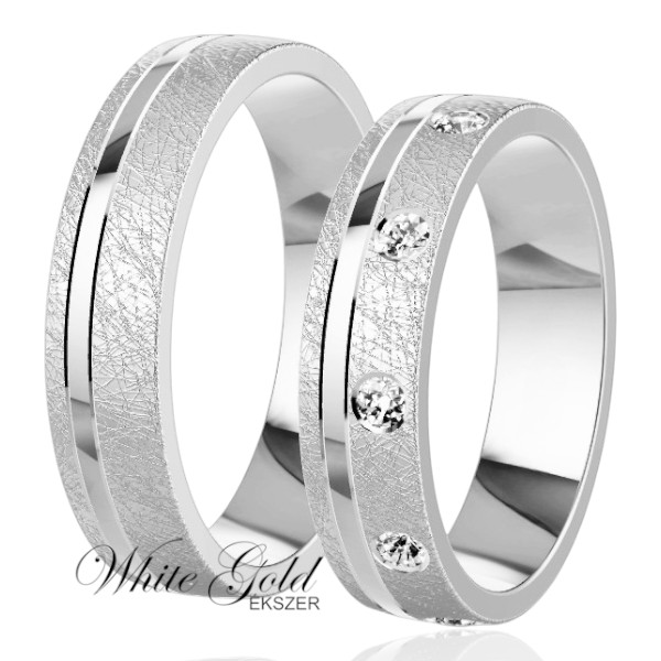 Ez a fehér arany karikagyűrű pár különleges jégkarc felületével és fényes szegélyével tűnik ki. A női gyűrűt ragyogó kövek díszítik, melyek elegánsan sorakoznak a matt felületen. A férfi gyűrű visszafogottabb megjelenésével tökéletesen illik hozzá, így harmonikus párost alkotnak.