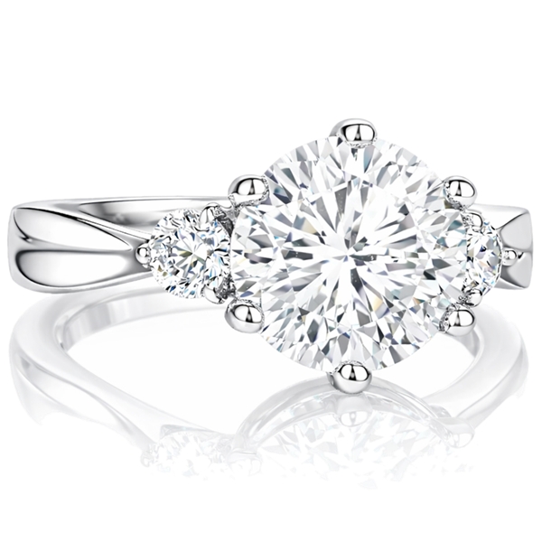 Fehér arany eljegyzési gyűrű kerek csiszolású, hangsúlyos méretű cirkónia központi kővel és két oldalkővel, karmos foglalatban. A középső kő határozott fókuszt kap, az oldalkövek finoman erősítik a fényt. Az összhatás látványos, kiegyensúlyozott és elegáns.