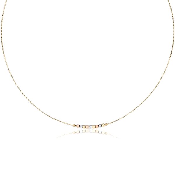Elegáns, háromszínű arany merev nyaklánc finoman csiszolt arany golyókkal a középpontban. A sárga, fehér és rozé arany árnyalatok harmonikus váltakozása különleges, mégis letisztult megjelenést ad. A karcsú, merev kialakítás szépen követi a nyak vonalát, így viselés közben elegáns és modern hatást kelt. Önállóan viselve is látványos ékszer, amely ünnepi és mindennapi megjelenéshez is tökéletes választás.
