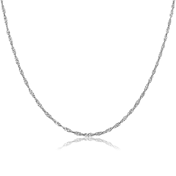 Fehér arany nyaklánc csavart szingapuri szemekkel, amelynek felülete szépen csillog és azonnal magára vonja a tekintetet. A szemek ritmusa folyamatos fényt ad a láncnak, ezért önmagában viselve is látványos. Nőies darab, amely kiemeli a nyak vonalát.