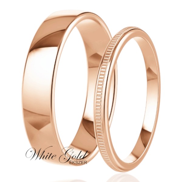Klasszikus tükörfényű felületű rozé arany karikagyűrű pár, ahol a férfi gyűrű letisztult eleganciát sugároz. A női gyűrű különleges, finoman rovátkolt díszítést kapott, amely modern textúrát és karakteres megjelenést ad.