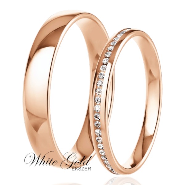Elegáns, klasszikus vonalú rozé arany karikagyűrű pár, amelynek női darabját egy finom, kecsesen futó kősor teszi ragyogóvá. A letisztult forma és a meleg rozé árnyalat harmonikusan egészítik ki egymást, időtálló választást teremtve.