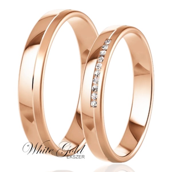 Letisztult és elegáns rozé arany karikagyűrű pár, ahol a férfi modell klasszikus, fényes felületű, a női gyűrűt pedig egy finom, egyenes sorköves díszítés teszi ragyogóvá. A vékony mart vonal könnyed keretet ad az egész formának, így a gyűrűk egyszerre modern és ízléses megjelenésűek – tökéletes választás mindennapi viselésre.