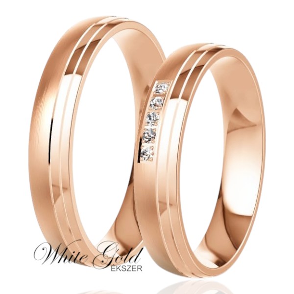 Rozé arany karikagyűrű pár finom gyémántvésésű kettős vonallal