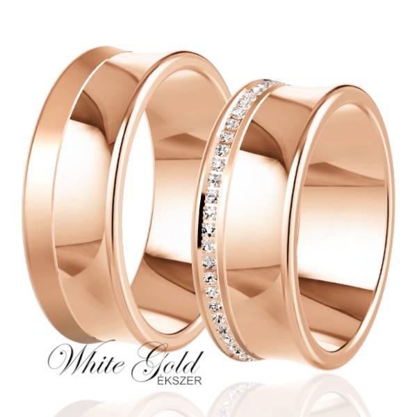 Elegáns és különleges rozé arany karikagyűrű pár, amelyet a lágyan ívelt, homorú formájú felület tesz igazán egyedivé. A női gyűrűt sorköves díszítés emeli ki, amely látványos csillogást ad a klasszikus, letisztult formának. Kényelmes, időtálló viselet, amely harmonikusan simul a kézre.