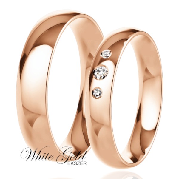 Ez a rozé arany karikagyűrű pár elegáns, magasfényű megjelenést kínál, amely időtlen és kifinomult. A férfi gyűrű letisztult, klasszikus kialakítású, míg a keskenyebb női modell három elhelyezett kővel díszített, amelyek finom, mégis feltűnő ragyogást adnak. Kényelmes és harmonikus forma, amely hosszú éveken át stílusos választás marad.