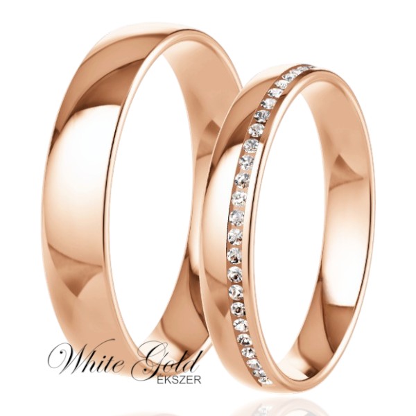 Ez a rozé arany karikagyűrű pár időtálló, magasfényű megjelenésével a klasszikus eleganciát képviseli. A férfi gyűrű letisztult, sima felületű, míg a keskenyebb női modell finom, hosszanti kősorral díszített, amely ragyogó és modern hatást kelt. Kényelmes viselhetősége és harmonikus formája miatt hosszú távra szóló, stílusos választás.