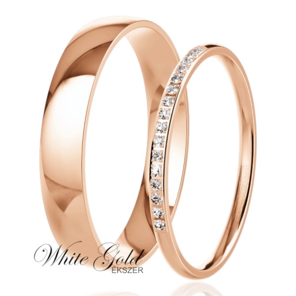 Ez a rozé arany karikagyűrű pár a klasszikus elegancia és a modern finomság találkozása. A férfi gyűrű fényes, letisztult felületű, míg a női modell keskeny, könnyed formáját egy ragyogó sorkő teszi különlegessé. Diszkréten elegáns, harmonikus megjelenés, amely tökéletes mindennapi viseletre és alkalmakra is.