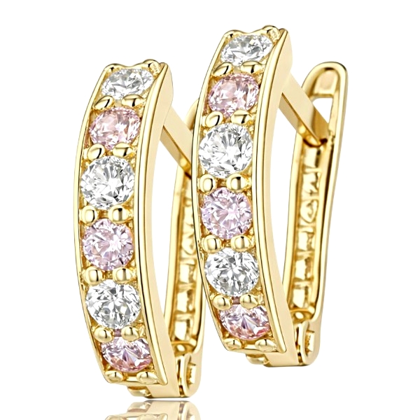 Ez a sárga arany baba fülbevaló váltakozó fehér és rózsaszín kövekkel készült, finoman ívelt formában. A francia kapcsos zár biztonságosan és stabilan tart, így kényelmes viselet babák számára. A kövek rendezett elhelyezése visszafogott díszítést ad, a sárga arany pedig szépen kiemeli a színeiket. Harmonikus, igényesen kidolgozott darab a mindennapokra.