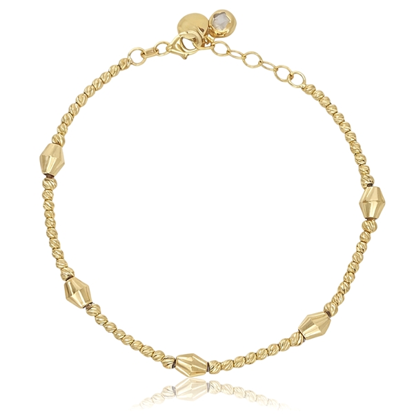 A karkötőt apró, gyémántvésett arany gömbök alkotják, amelyek finoman törik meg a fényt és egységes, rendezett összhatást adnak. A letisztult vonalvezetés miatt könnyed, nőies ékszer, amely diszkréten, mégis elegánsan simul a csuklóra. Klasszikus választás mindennapi viselethez.
