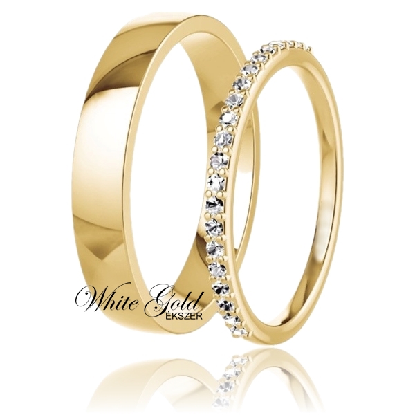 Elegáns sárga arany karikagyűrű pár, amelynél a női gyűrű finom kövekkel díszített, a férfi gyűrű pedig fényes felületű. Kívánság szerint a szélességek variálhatók, egy darab is rendelhető.