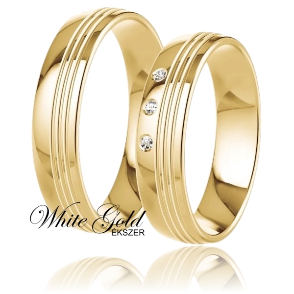 Letisztult, mégis különleges megjelenésű sárga arany karikagyűrű pár, hármas vonalmintával és finom kidolgozással.