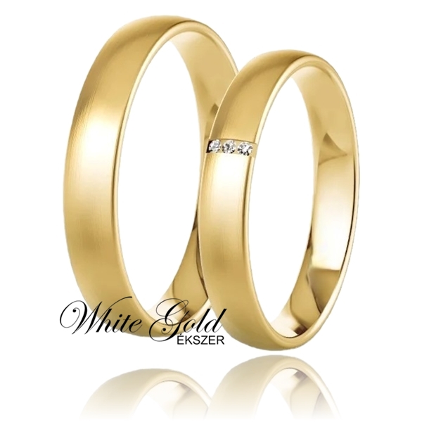 Matt felületű, finoman domború sárga arany karikagyűrű pár, háromköves női gyűrűvel.