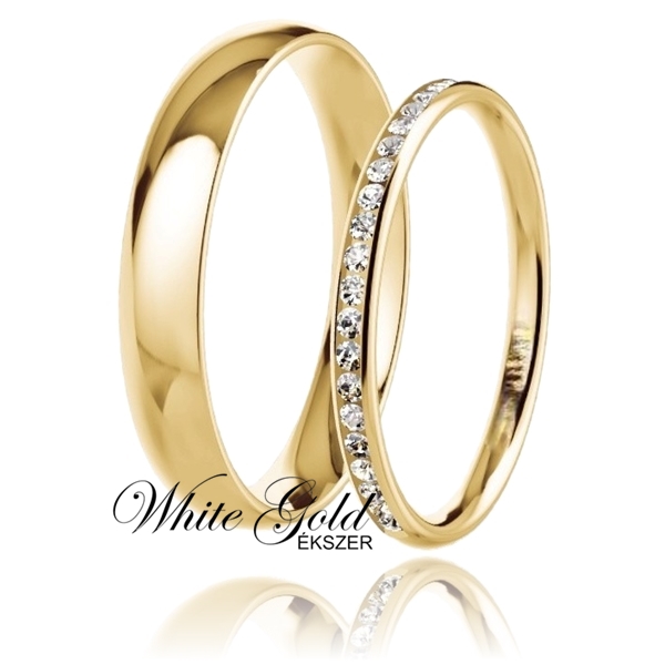 Klasszikus elegancia és finom nőiesség egy ékszerpárban. A sárga arany karikagyűrű-pár letisztult formája időtlen, a keskeny, sorköves női gyűrű pedig csillogó részleteivel teszi különlegessé. Tökéletes választás, ha a hagyomány és modern elegancia egyensúlyát keresitek.
