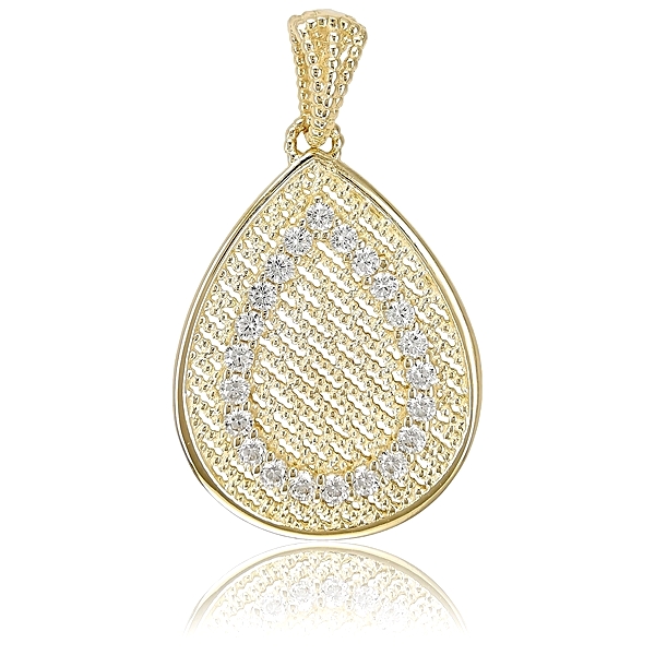 Ez a sárga arany csepp alakú medál finoman áttört felülettel készült, középen íves vonalban elhelyezett cirkónia kövekkel. A részletgazdag textúra és a kövek visszafogott csillogása elegáns, mégis különleges megjelenést ad az ékszernek. Nyakláncon viselve nőies, kifinomult kiegészítő, amely jól illeszkedik a mindennapi és alkalmi viselethez is.