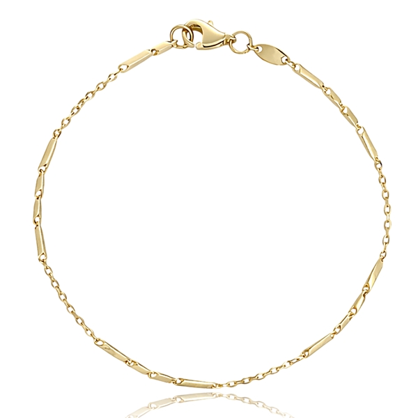 Sárga arany karkötő váltakozó, karcsú fantázia elemekkel és finom láncszemekkel. A hosszúkás betétek ritmusa könnyed mozgást és elegáns összhatást ad az ékszernek. Nőies arányai miatt diszkrét, mégis különleges kiegészítő a mindennapokra.