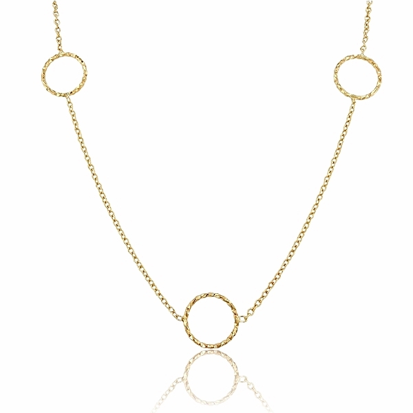 Letisztult sárga arany nyaklánc finoman megmunkált, kör alakú elemekkel, amelyek egyenletesen tagolják a láncot. A fényes felület és az ismétlődő forma harmonikus, elegáns összhatást ad. Könnyed, mégis karakteres darab, amely önmagában viselve is hangsúlyos, rétegezve pedig különösen jól érvényesül.