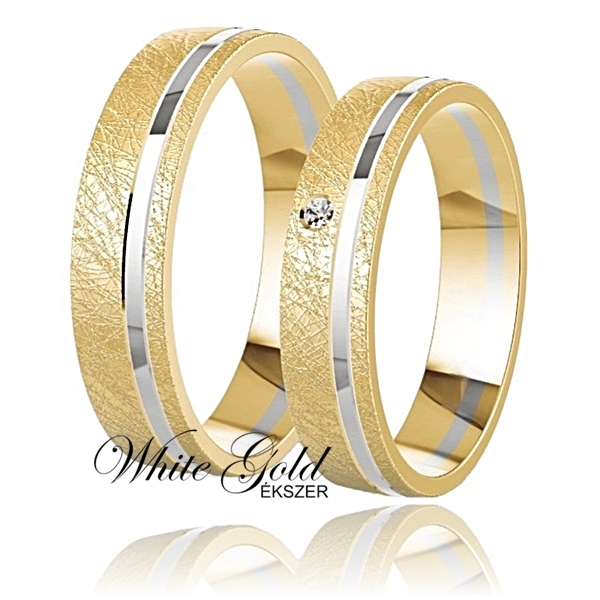 Különleges sárga és fehér arany karikagyűrű pár, amelyet a jégkarc felület egyedi textúrája és finom fényjátéka tesz igazán különlegessé. A fényes fehér arany sáv modern kontrasztot alkot a matt hatású sárga arannyal, míg a női gyűrűt egy apró, csillogó kő díszíti. Kifinomult, karakteres választás azoknak, akik a klasszikus eleganciát különleges részletekkel szeretik kifejezni.