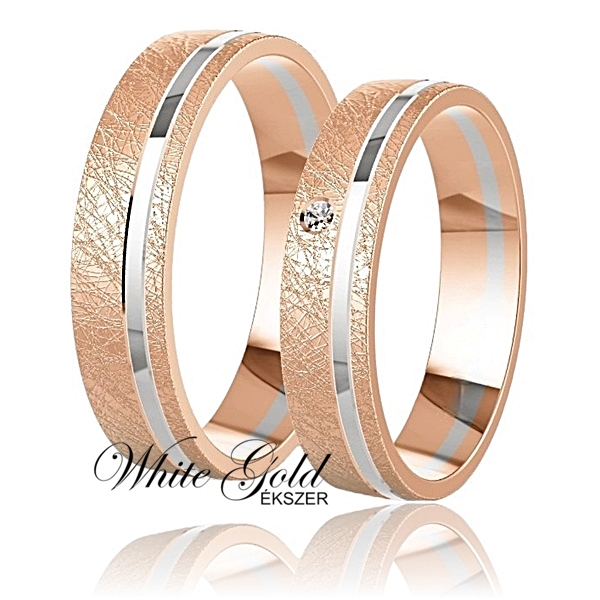 Rozé és fehér arany karikagyűrű pár jégkarc felülettel és egy kővel