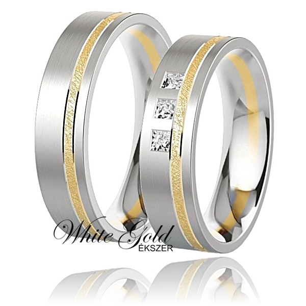 Sárga és fehér arany karikagyűrű pár lapos profillal és három kővel